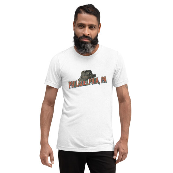Con un diseño minimalista en el pecho, presenta el icónico sombrero fedora acompañado del texto «Philadelphia, PA» en una tipografía de estilo universitario vintage. Es la elección perfecta para quienes buscan un homenaje sutil al cine clásico y un estilo urbano sobrio.