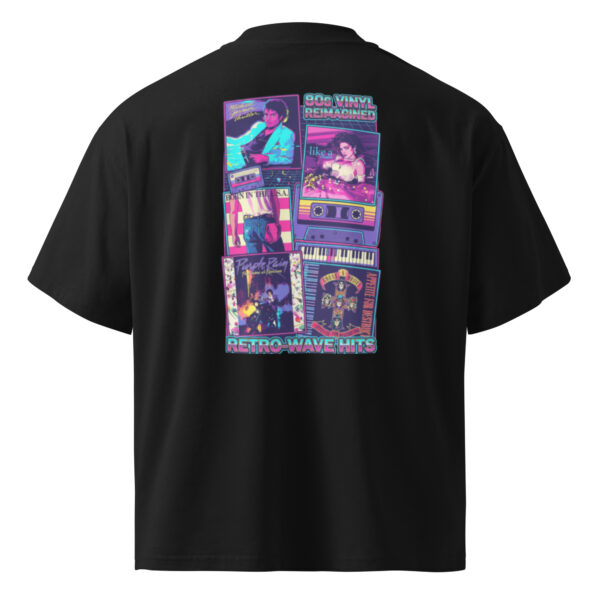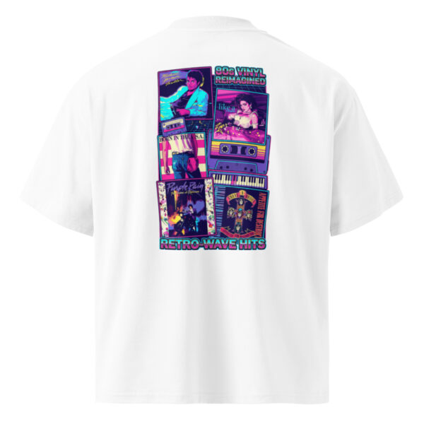 Camiseta con impresión trasera de alta calidad con gráficos inspirados en portadas de álbumes de los 80 y la estética Retrowave.